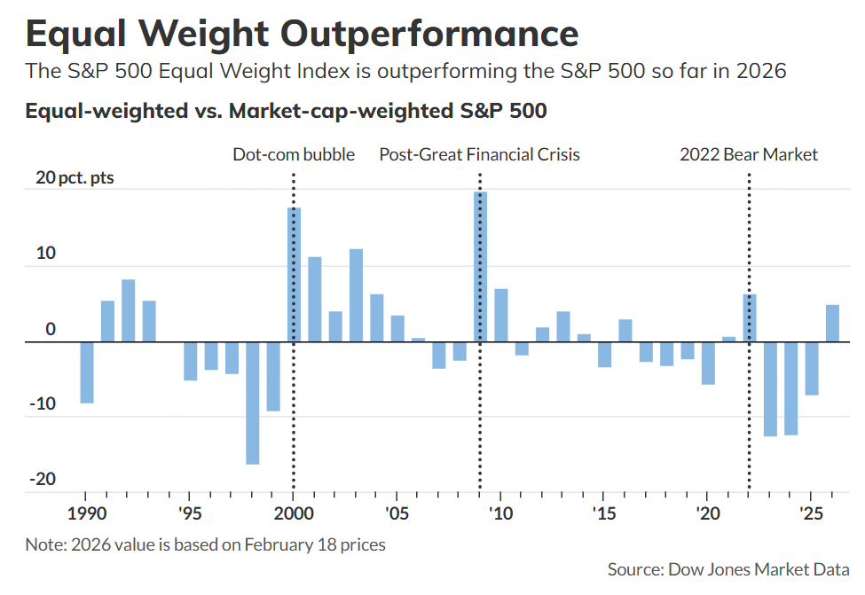 The S&P 500 equal-weighted index has risen 5.5% during the first 32 trading sessions of the year, outpacing the tiny 0.1% gain for the traditional market-cap-weighted index. That's the most extreme gap at this point going back to 1992.