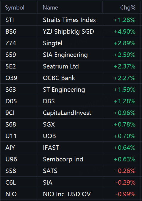 The Straits Times Index (STI), a key benchmark for the Singapore Exchange, ranged between 4,978.18 and 5,006.43 throughout the day. It ended the session at 5,001.56, up 62.98 points or 1.3% compared to Monday's close.