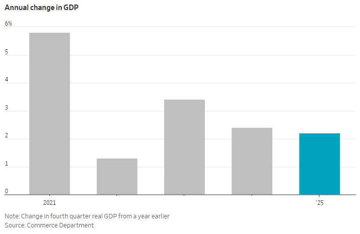 Gross domestic product in 2025 expanded by 2.2%, measured from the fourth quarter of the prior year, down from 2.4% in 2024 and the slowest pace since 2022. The record-long government shutdown in the fall crimped growth in the most recent quarter.