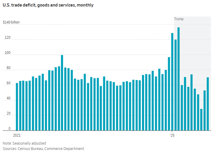 Trump isn't a deficit fan, but he hasn't managed to stop them: The goods-trade deficit rose to a record $1.241 trillion in 2025, up from $1.215 trillion in 2024, although it fell slightly as a share of the economy. Tariffs weren't enough to discourage imports, partly because many goods were exempt. Also, U.S. firms were often able to switch to suppliers in countries facing lower levies, like tapping smartphones from India rather than China. Surging chip imports from Taiwan to feed the AI boom also helped prop up the trade deficit.