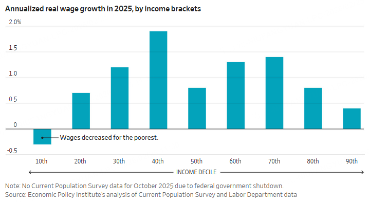 Overall, real wages rose slightly faster in the 12 months ended in January than in the prior 12 months. That resilience, combined with the low unemployment rate, helps explain why consumer spending has held up, boosting the economy. But the picture isn't all positive. Americans with the lowest incomes saw their real wages fall in 2025, according to a study from the Economic Policy Institute, a think tank that analyzed census data.