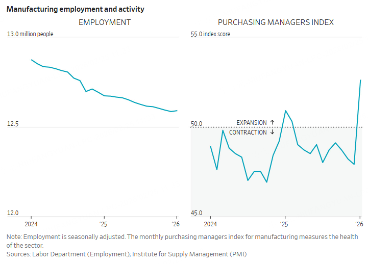Despite weak employment, however, manufacturing production rose 2.6% on the year, according to the Federal Reserve. Manufacturing jobs also edged higher in January. Also, a monthly index on factory activity from the Institute for Supply Management showed expansion for the first time since February 2025.