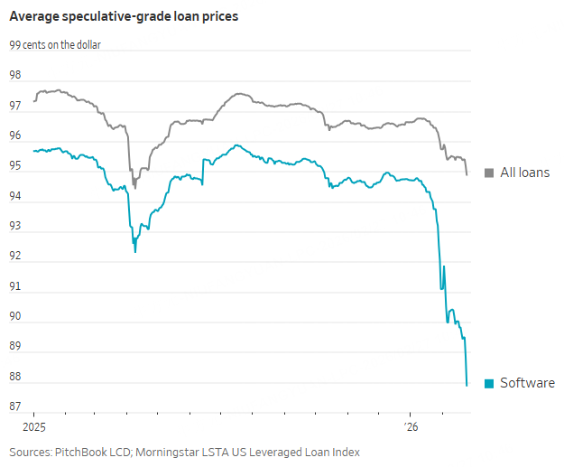 Prices of actively traded software-company loans have tumbled since mid-January, a sign investors are increasingly concerned about a surge in defaults in the sector.