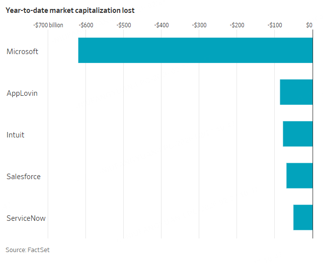 All together, components of the State Street software ETF have lost a combined $1.6 trillion in market capitalization this year. Microsoft, AppLovin Corporation, Intuit, Salesforce.com and ServiceNow have each lost at least $50 billion in market capitalization.