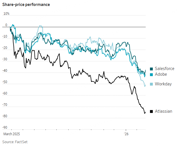 Concern over the threat that artificial intelligence poses to software companies has hit the shares of companies like Salesforce and Adobe hard. Investors are questioning whether software companies that sell to businesses can withstand competition from AI-powered rivals. Lately, the selloff has intensified with each new announcement from AI developers.