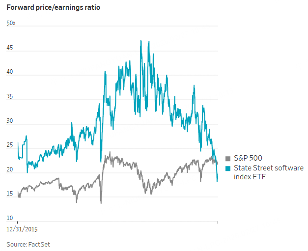 With those share-price declines has come a rapid drop in valuation. Companies in the State Street software ETF trade at roughly 19 times their next 12 months of earnings, down from a peak of more than 47 times in 2022. Companies in the broad S&P 500, meanwhile, are trading at close to 22 times forward earnings.
