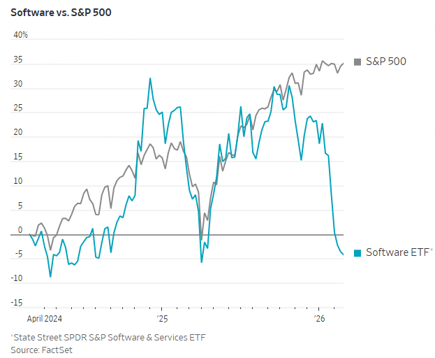 The software plunge comes even as broader stock indexes hold their ground near records. The State Street SPDR S&P Software & Services ETF, which tracks an equal-weight benchmark of about 140 software companies, has dropped 20% in the first two months of 2026 and almost 30% since its high from this past fall.