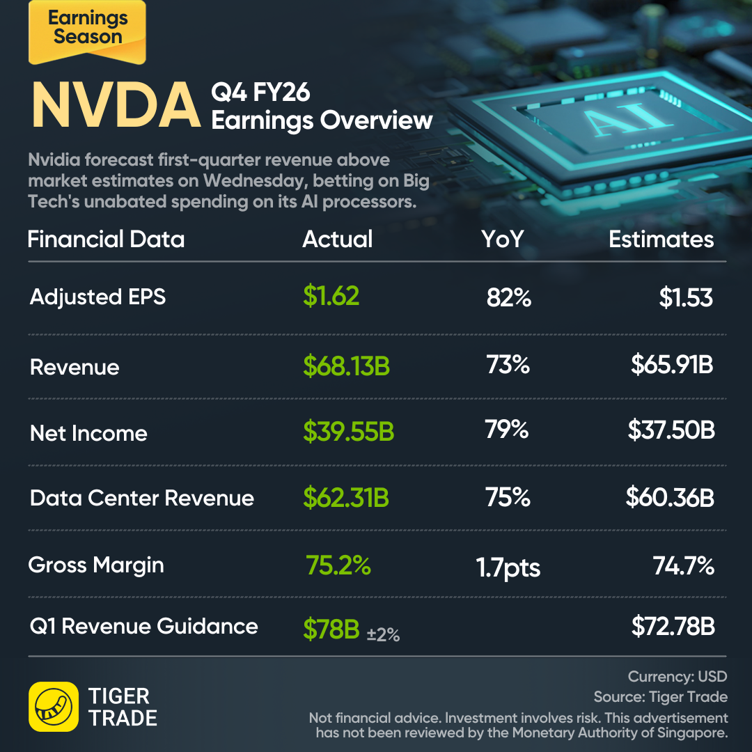 Nvidia reported January-quarter sales of $68.13 billion, beating estimates of $66.21 billion, according to LSEG data. It said adjusted profit came in at $1.62 per share, compared with estimates of $1.53, according to LSEG data.