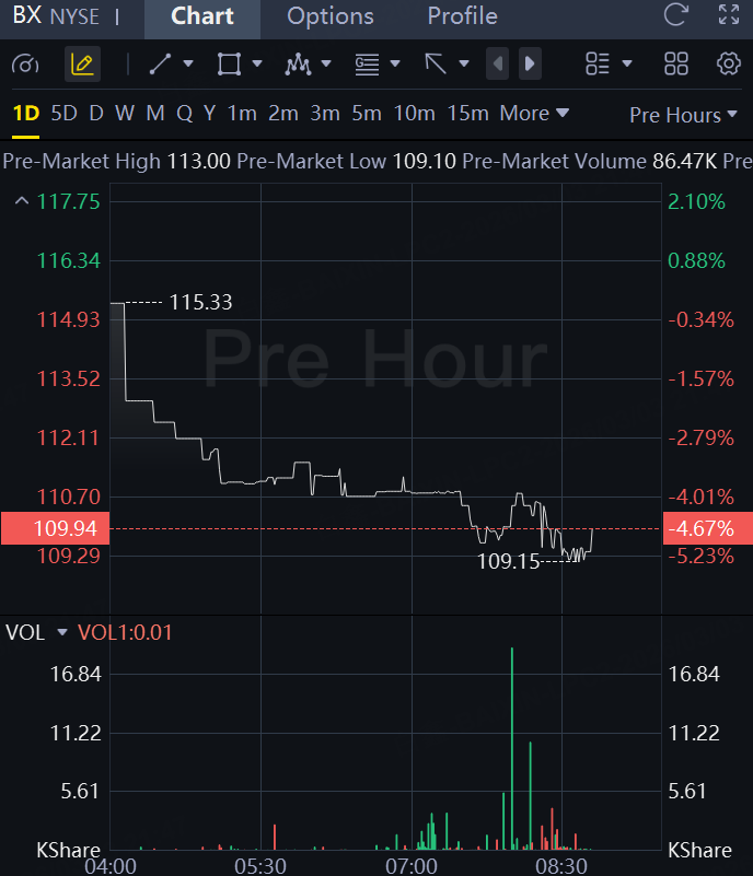 Blackstone shares dropped 4.7% in premarket trading Tuesday, while Blue Owl fell 4.5%, KKR declined 2.6%, Apollo Global Management fell 2.7%, and Ares Management slipped 2.2%.