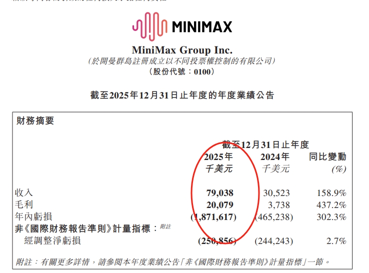3月2日晚间,MINIMAX发布2025财年财报,公告显示MINIMAX2025财年收入7900万美元,同比增长158.9%。其中超过70%的收入来自国际市场。年度亏损18.7亿美元,同比增加302.3%。经调整净亏损2.51亿美元,较上年同期的经调整净亏2.44亿美元增长2.7%。