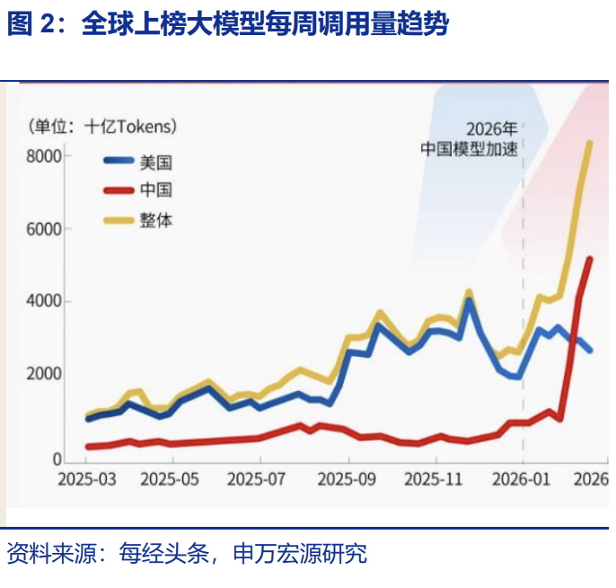 申万宏源研究援引数据显示,春节期间国内头部大模型推理量大幅增长:豆包除夕当天推理吞吐量达633亿tokens,元宝月活跃用户达1.14亿,千问“春节大免单”活动参与人数超1.2亿。