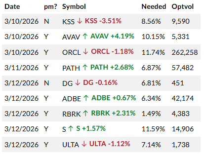Currently, the March 13 at-the-money straddle is priced at about 12% of Oracle's stock price. That's a bit expensive. Note the ORCL entry in the table below, where the "count" shows 11.74%. Six of the past 10 earnings moves for ORCL have been 11.74% or greater. So we'd like to be able to buy the straddle for that price just before earnings are announced - that is, buy late in the trading day on March 10.