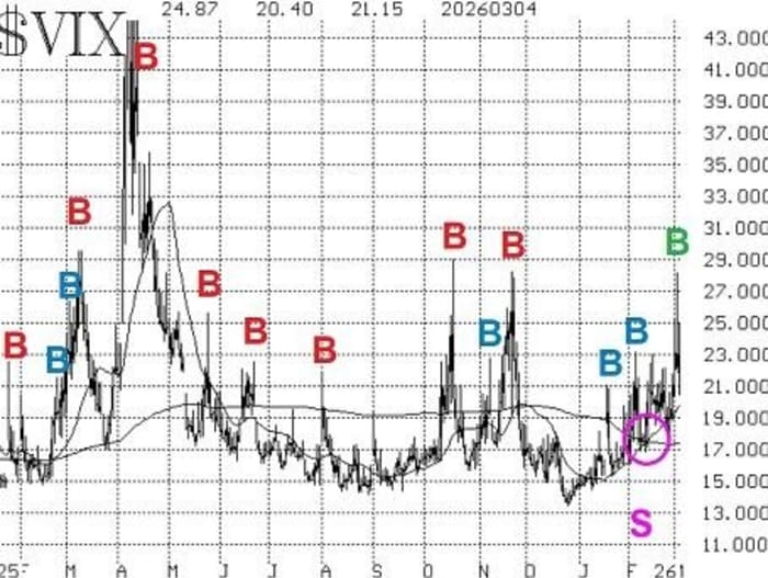 When the market dropped sharply on March 3, VIX roared up to 28. But by the end of the day, stock prices had recovered and VIX had fallen. In fact, VIX generated a new "spike peak" buy signal for the stock market. These signals last for a maximum of 22 trading days - about a month - so buy S&P 500 options with an expiration date just over a month from now.