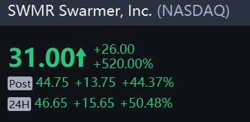 Swarmer shares soared 50% in overnight trading after rocketing 520% on Tuesday in their first day of trading after the company's initial public offering.