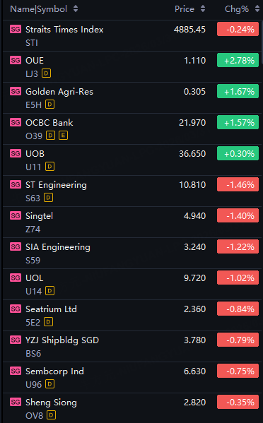 STI down 0.2%; OUE up 3%; OCBC up 2%; SIA Engineering, Singtel, UOL, Seatrium down 1%.