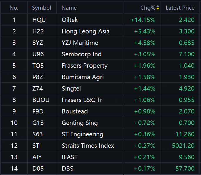 Oiltek up over 14%; Hong Leong Asia up over 5%; YZJ Maritime up over 4%; Sembcorp Ind up 3%; Frasers Property up 2%; Singtel, Frasers L&C Tr up 1%.