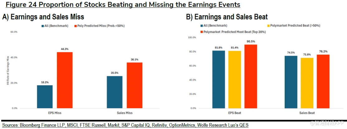 经纪公司Wolfe Research的报告显示,当Polymarket用户押注某家公司盈利将不及预期时,准确率高达44%,是18%历史基准水平的两倍多;而当交易者高度确信企业业绩会超预期时,这一判断的准确率可达90%,高于81%的行业平均水平。