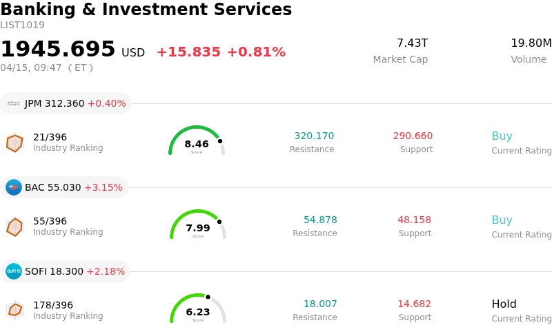 Morgan Stanley (MS) opened up by 3.09%. The Banking & Investment Services sector is up by 0.81%. The company outperformed the industry. Top 3 stocks by turnover in the sector: JPMorgan Chase & Co (JPM) up 0.40%; $Bank of America Corp(BAC-N)$ (BAC) up 3.15%; SoFi Technologies Inc (SOFI) up 2.18%.