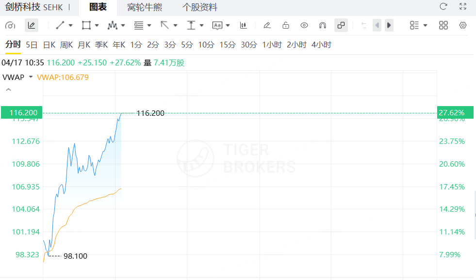 4月17日,剑桥科技高开高走,盘中股价涨幅扩大至27%。