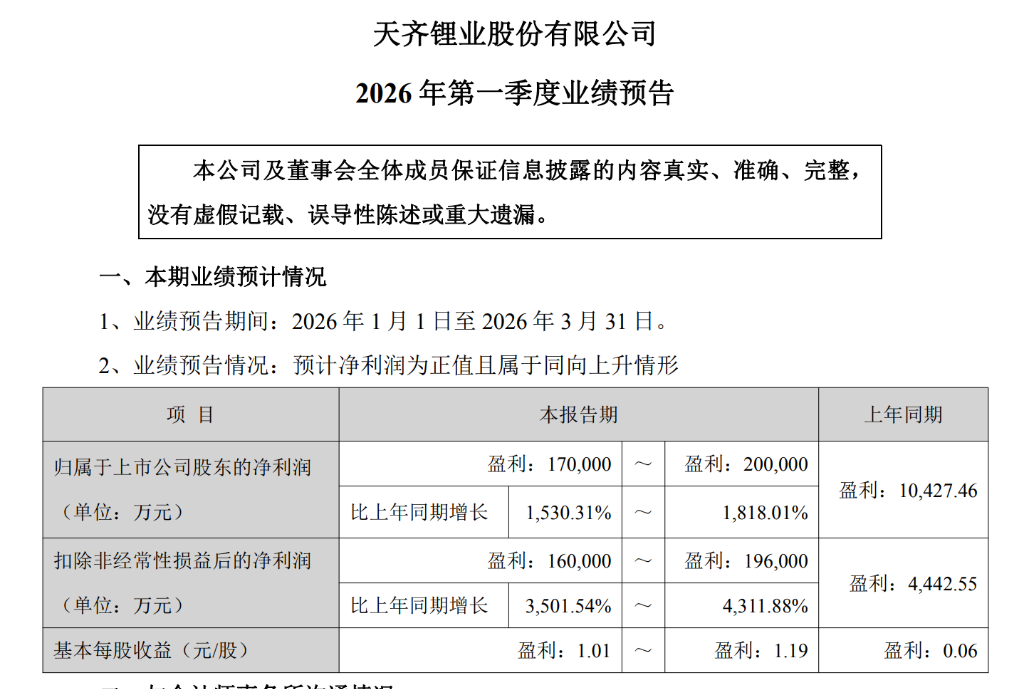 4月21日,天齐锂业披露2026年一季度业绩预告,预计归属于上市公司股东的净利润为17亿元至20亿元,较上年同期的1.04亿元大幅增长1530%至1818%,盈利规模实现量级跨越。