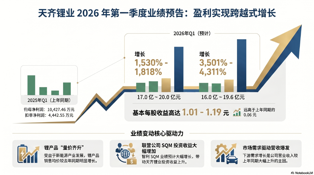 业绩强劲反弹的核心逻辑在于两条主线共振:一是新能源下游需求持续扩张,推动锂产品销售均价同比明显回升,带动营业收入大幅增长;二是公司持股的智利锂矿巨头SQM预计一季度业绩同比大幅增长,相应增厚天齐锂业确认的联营公司投资收益。