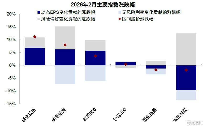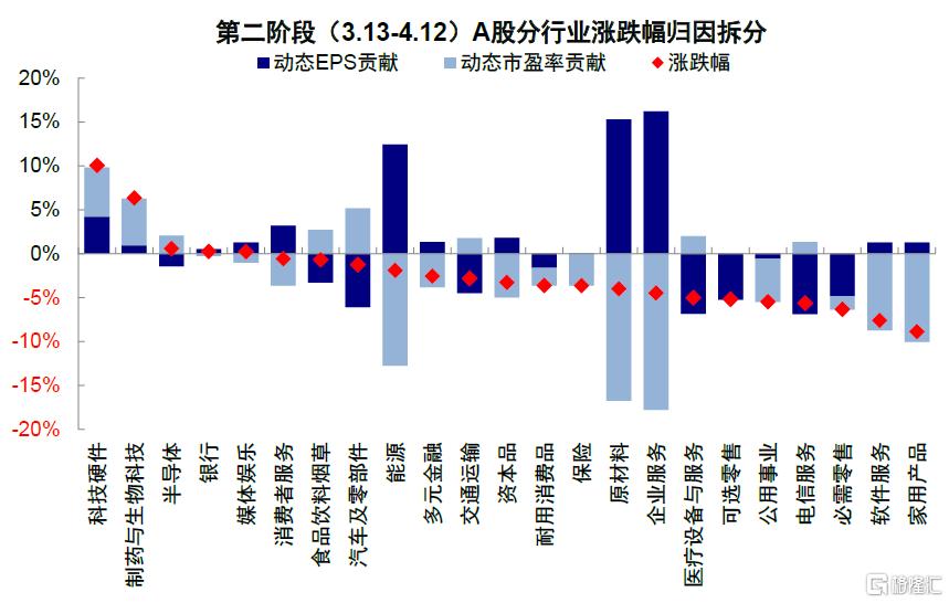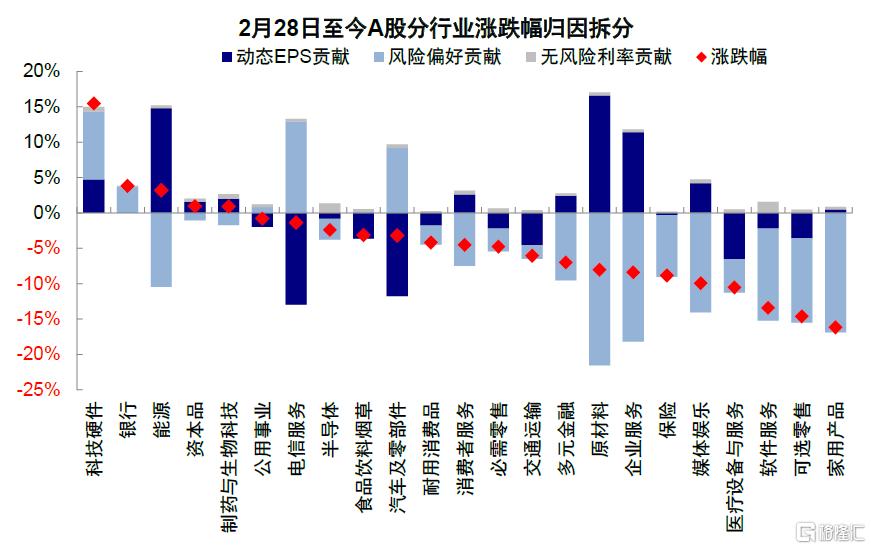 图表:2月28日以来,科技股涨幅主要依赖风险溢价与业绩预期共同贡献