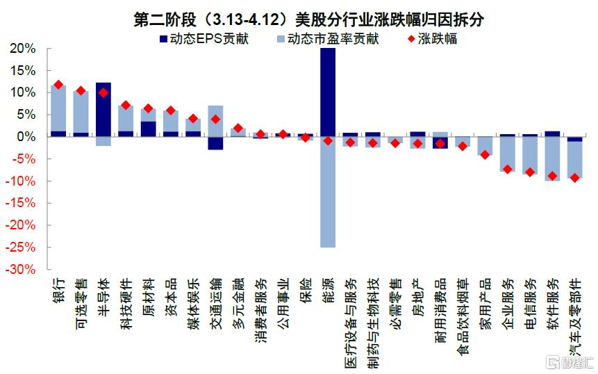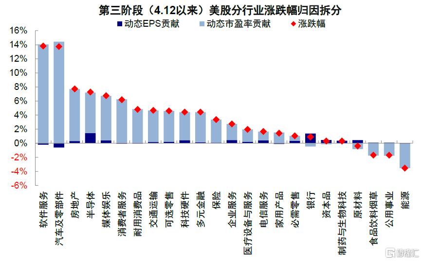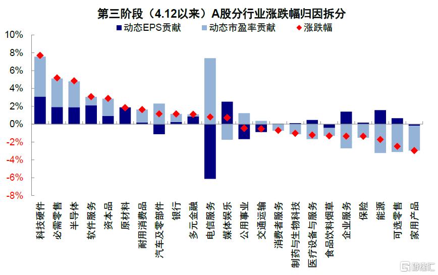 ► 权益市场内部,美A港市场反弹主要归因于情绪,即股权风险溢价;结构上,第一,能源板块从第二阶段的居中震荡,转为全市场表现落后的品种;第二,具备独立产业景气逻辑的科技板块领涨主线进一步强化,仍是全市场表现最强的方向,涨幅同时受益于估值和盈利的抬升;第三,顺周期板块也有所修复,前期受情绪压制的地产、汽车、消费服务等品种随尾部风险消退迎来估值修复。