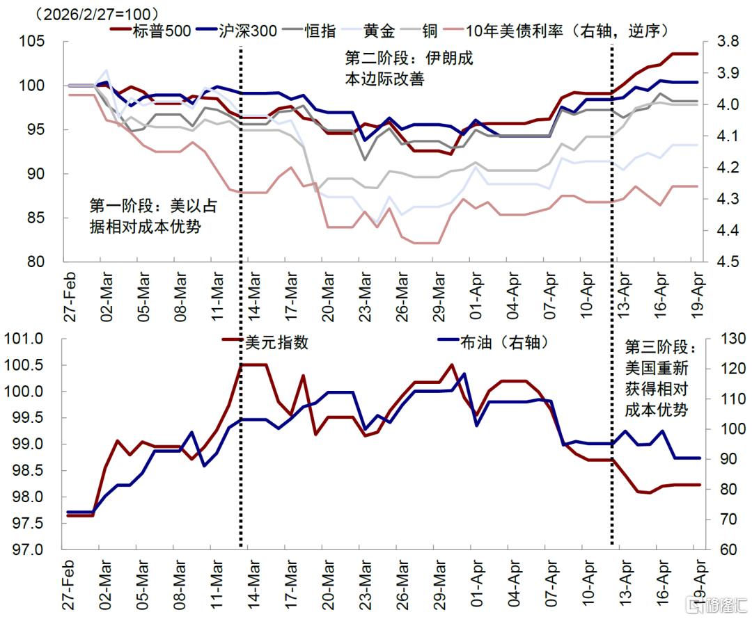 基于这一前提和分析框架,我们将伊朗局势演绎至今的一个半月划分为三个阶段,不同阶段的博弈格局、相对成本更大的主体与资产定价逻辑均存在显著差异。厘清这一点,也有助于帮助我们判断伊朗局势未来的可能演变方向。