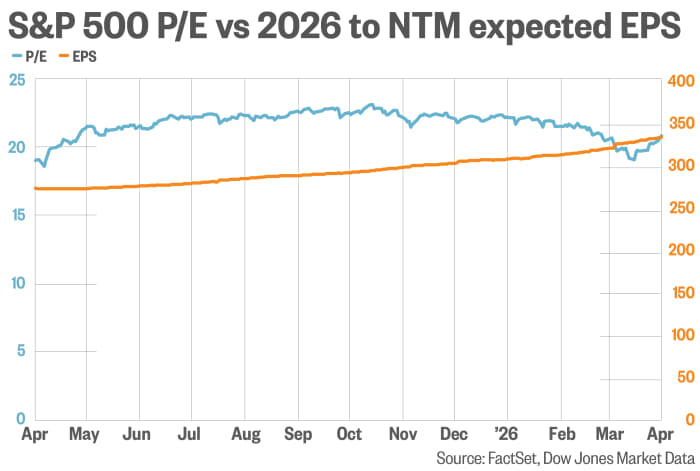 The pattern can be seen in the chart below, which compares the forward price-to-earnings ratio for the S&P 500 with analysts' forecasts for earnings per share over the next 12 months for the index's member companies. Forward earnings per share measures how much investors are paying for a stock or index compared with how much companies are expected to earn over the next year.