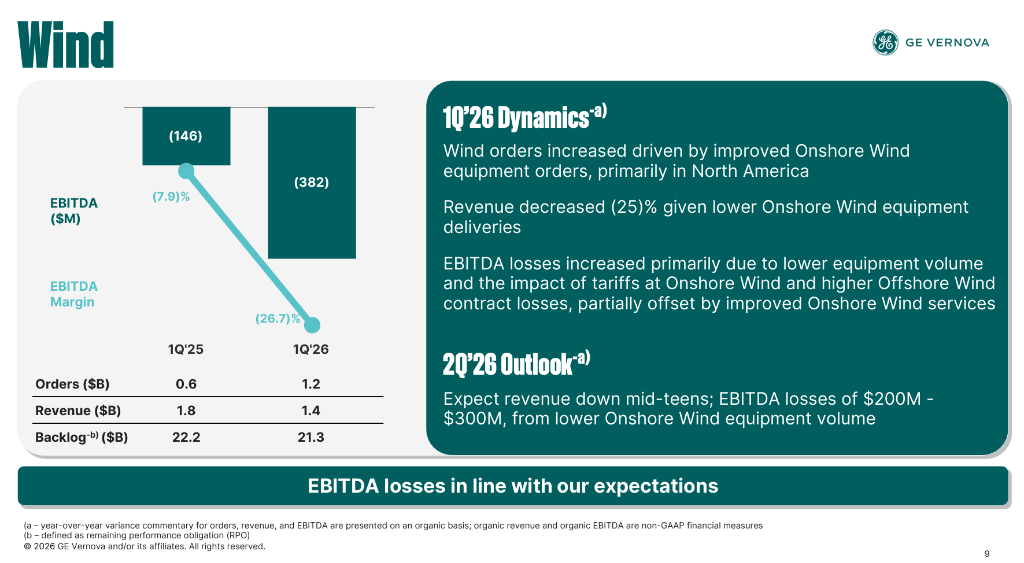 Wind(风电)分部仍是整体业绩的主要拖累。分部一季度收入为14亿美元,同比下降23%,原因在于2025年上半年陆上风电订单偏软导致本季度设备交付量大幅下滑。分部EBITDA亏损扩大至3.82亿美元,利润率为-26.7%,同比下降1880个基点。