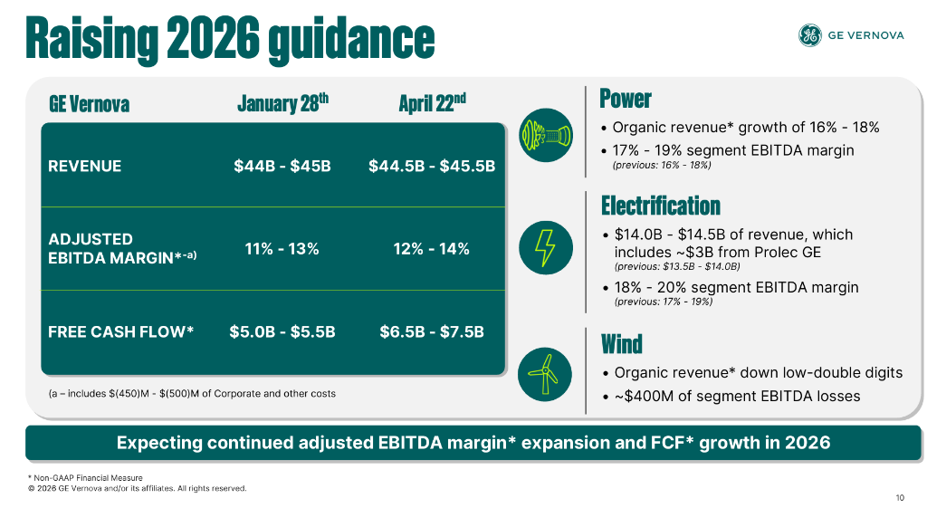 基于一季度强劲业绩及业务积压的持续积累,GE Vernova全面上调2026年全年财务指引:收入指引从440亿至450亿美元上调至445亿至455亿美元;调整后EBITDA利润率从11%-13%上调至12%-14%;自由现金流从50亿至55亿美元大幅上调至65亿至75亿美元,指引区间中值增幅接近40%。