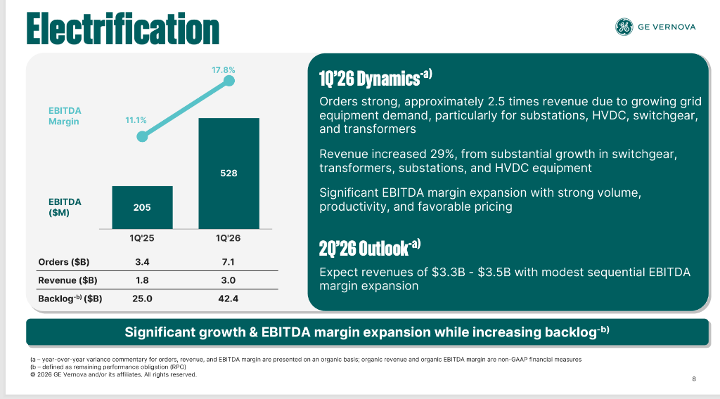 Scott Strazik特别指出,电气化分部本季度来自数据中心的设备订单达24亿美元,已超越2025年全年总额。受益于Power Transmission及Grid Systems Integration的量价齐升与效率改善,分部EBITDA利润率升至17.8%,同比大幅提升670个基点。