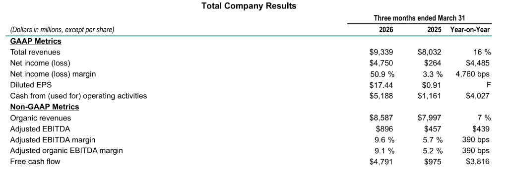 公司于4月22日公布的数据显示,一季度订单达183亿美元,同比有机增长71%;调整后EBITDA近乎翻倍至8.96亿美元,利润率升至9.6%,同比提升390个基点;自由现金流达48亿美元,不仅同比增逾三倍,更超越2025年全年总额。积压订单较上季度增加逾130亿美元,升至约1630亿美元。