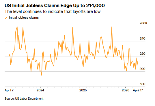 智通财经APP获悉,上周,美国初请失业金人数略有上升,但仍处于近年历史健康水平。美国劳工部周四公布的数据显示,截至4月18日当周,美国初请失业金人数较前一周增加6000人,升至21.4万人,略高于分析师预期的21万人。