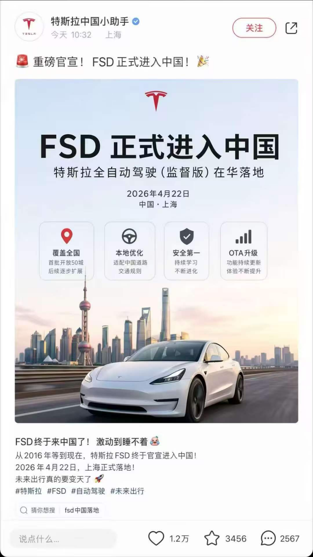 就在市场情绪因传言而升温之际,自媒体账号"特斯拉中国小助手"发帖称,FSD已于4月22日正式进入中国,消息迅速在投资者和车主群体中扩散,引发广泛关注。