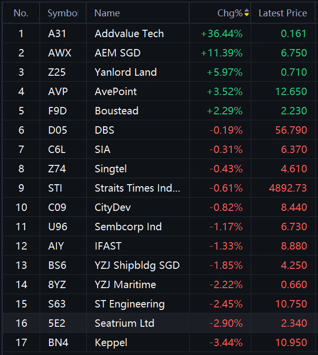 Addvalue up 36%; AEM SGD up 11%; Yanlord Land up 6%; AvePoint up over 3%; ST Engineering down 2%; Seatrium, Keppel down around 3%.