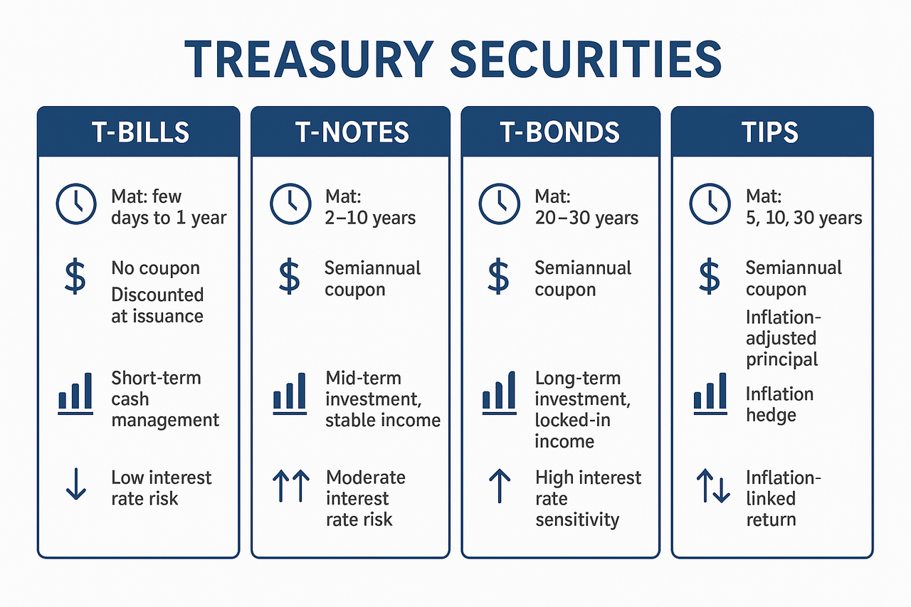 T-Bonds: longer maturities (20-30 years), higher yields but greater duration risk.