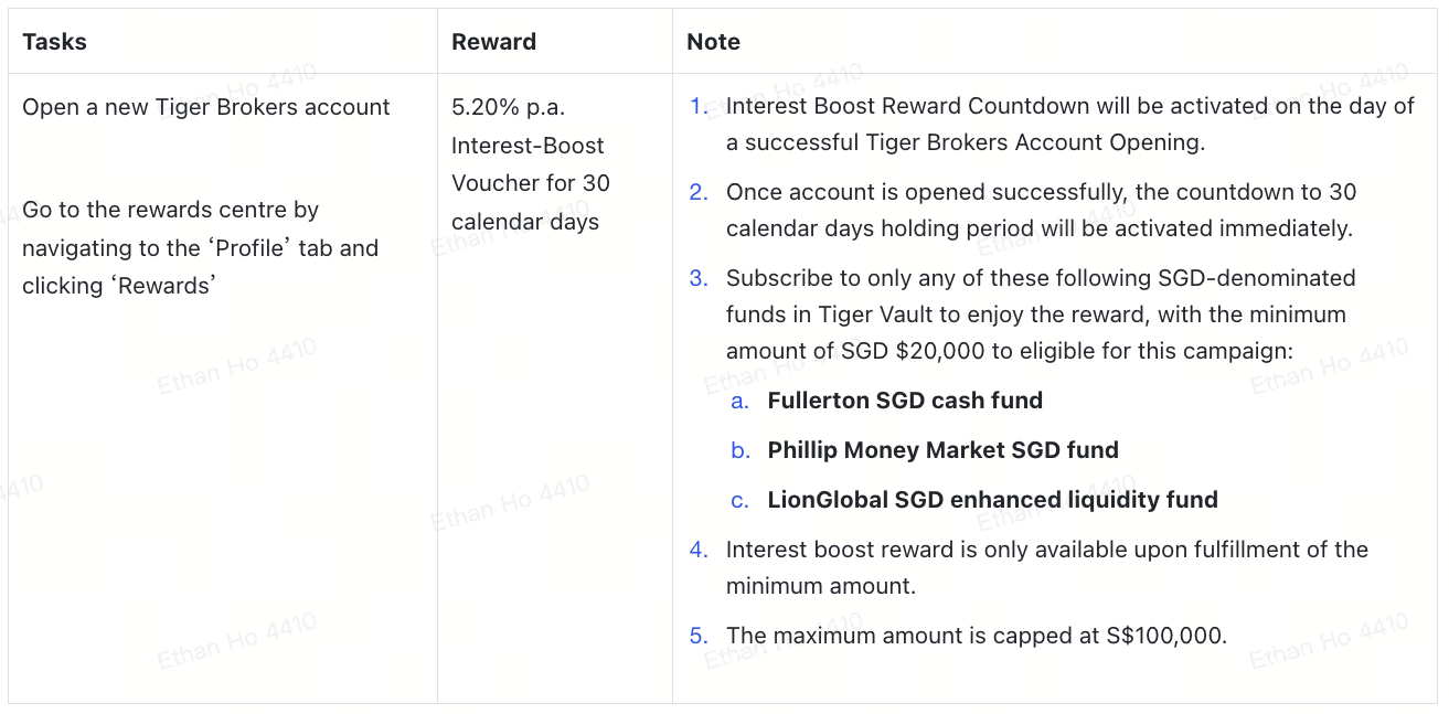 The selected fund itself does not guarantee any capital preservation or interest. In this reward, Tiger Brokers provides reward returns on top of the underlying product's earnings, up to an annualized return of 5.20% p.a, for 30 calendar days.