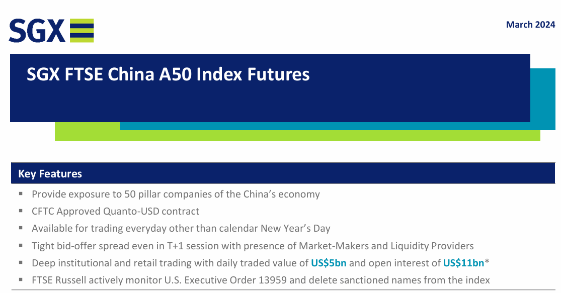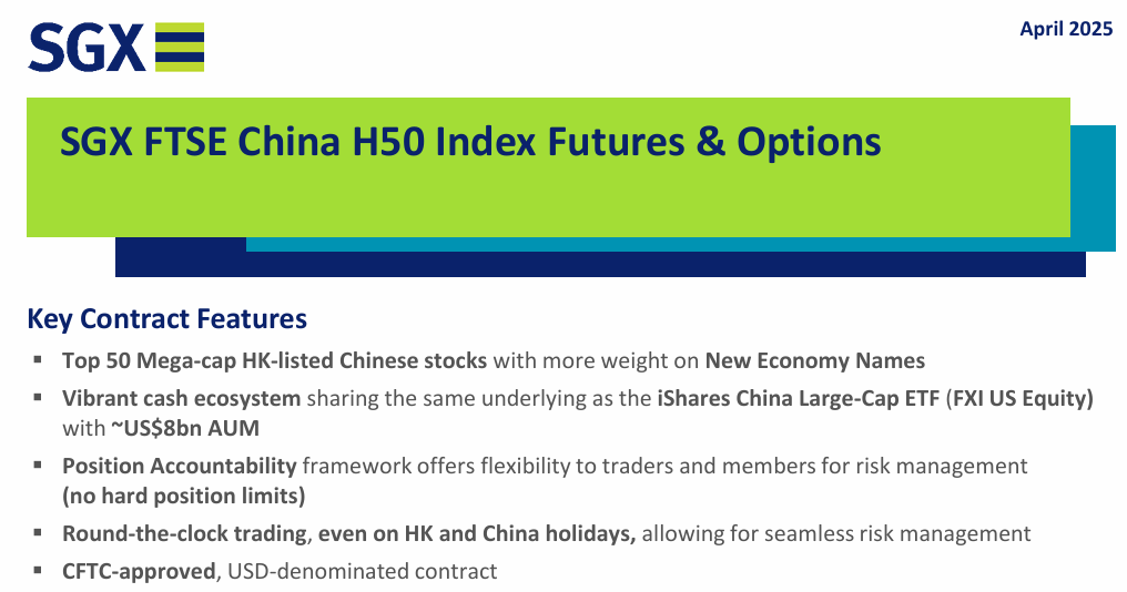 Similarly, the H50 Futures listed on the Singapore Exchange (SGX) is linked to 50 of the largest Chinese-funded stocks listed in Hong Kong. It also features a nearly 20-hour trading window, allowing investors to respond to market changes through H50 Futures even when the Hong Kong market is closed.